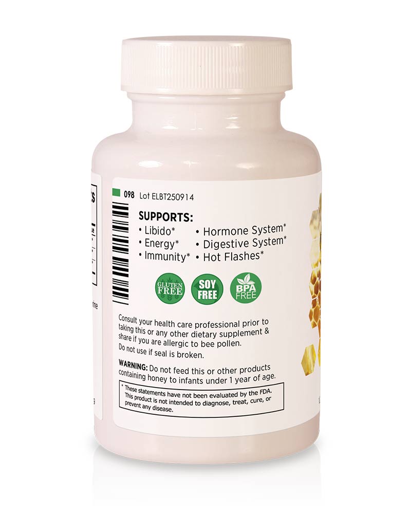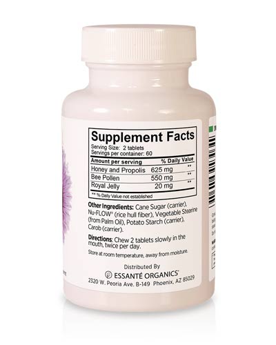 See labels for organic ingredients. Supports energy, immunity, digestion, libido, histamines, hot flashes, hair growth 120 sweet, chewable prebiotic tablets per bottle Every known ingredient necessary to sustain life Made of Bee Pollen, Royal Jelly, Honey & Propolis 22 Amino Acids & 27 Minerals Provitamin A & vitamins C, D, E, K Biotin, choline, folate, inositol Vitamins B1, B2, B3, B5, B6 and B12 Enzymes & Coenzymes Bioflavonoid Rutin Potassium, magnesium, manganese Calcium, zinc, iron SUGAR: No added sugars (naturally occurring sugars in Bee Pollen and Honey equal 0.28g per tablet) CALORIES: 1 serving (2 tablets) contain 14 calories. Breakdown: Honey 312.5 mg = 0 calories. Propolis 312.5 mg = 14 calories. Bee Pollen 550 mg = 0 calories. Royal Jelly 20 mg = 0 calories. CARBS: 1 serving (2 tablets) contain 0.53 grams (about half a gram) of carbohydrates. Breakdown: Honey 312.5 mg = 0 carbs. 312.5 mg of Propolis = 78.13 mg carbs. 550 mg of Bee Pollen = 137.5 mg carbs. 20 mg of Royal Jelly = 3 mg of carbs. BEE NATURAL INFORMATION SHEETS FOR PRINTING:DOWNLOAD US OR EU PRINT SIZE 8.5x11 Size A4 Size PURCHASE HIGH QUALITY GLOSSY TEAR OFF PADS HERE ⟫ TESTIMONIALS & ADDITIONAL DETAILS BELOW See details and testimonials below Per the FDA: Sales Executives, who are not licensed medical providers, cannot use a medical diagnosis, dedication, or medical term when marketing Essante Organics Bee Natural Prebiotic Vitamin Supplements including: Allergy, Allergies, Diabetes, Erectile Dysfunction, High blood pressure, Impotence, Low blood pressure, Menopause, Natural remedy for erection, Viagra alternative, Weight loss, etc. The bullet point above are FDA compliant terms.