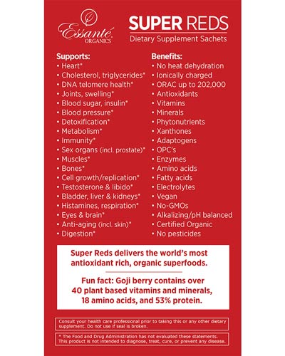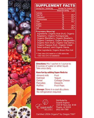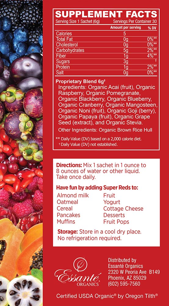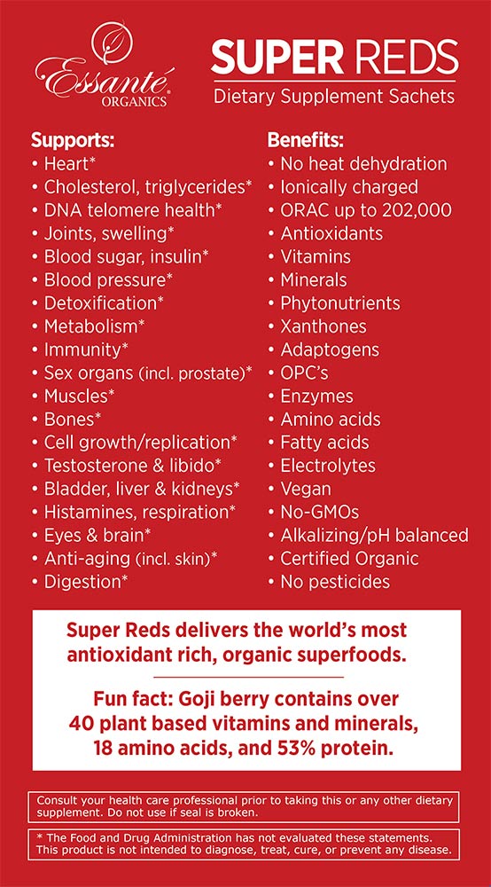 See labels for organic ingredients. 5.5 lbs. of organic whole fruit nutrition per serving Alkaline (pH balanced) super fruits ORAC value score: up to 202,000 OPC’s, adaptogens, antioxidants, ionic minerals Enzymes, phytonutrients, xanthones, resveratrol Vegan, live, raw, organic, whole food nutrition Ionic charge = isotonic, most absorbable & bioavailable No heat pasteurization / no high heat dehydration Sweetened with Stevia, low GI (Glycemic Index) Only 5 calories per serving Add powder to water, or enjoy it straight like a pixie stick Addictively delicious organic berry taste SUPPORTS Alkalizing, detoxifying, cleansing, energy, blood sugar, blood pressure, head pressure, discomfort, swelling, joint health, immunity, immune system, autoimmune health, yeast buildup, cardiovascular heart health, cell replication, cellular health, telomere DNA, muscle health, nerve health, weight management, & stress. SUPER REDS INFORMATION SHEETS FOR PRINTING: DOWNLOAD US OR EU PRINT SIZE 8.5x11 Size A4 Size PURCHASE HIGH QUALITY GLOSSY TEAR OFF PADS HERE ⟫ TESTIMONIALS & ADDITIONAL DETAILS BELOW