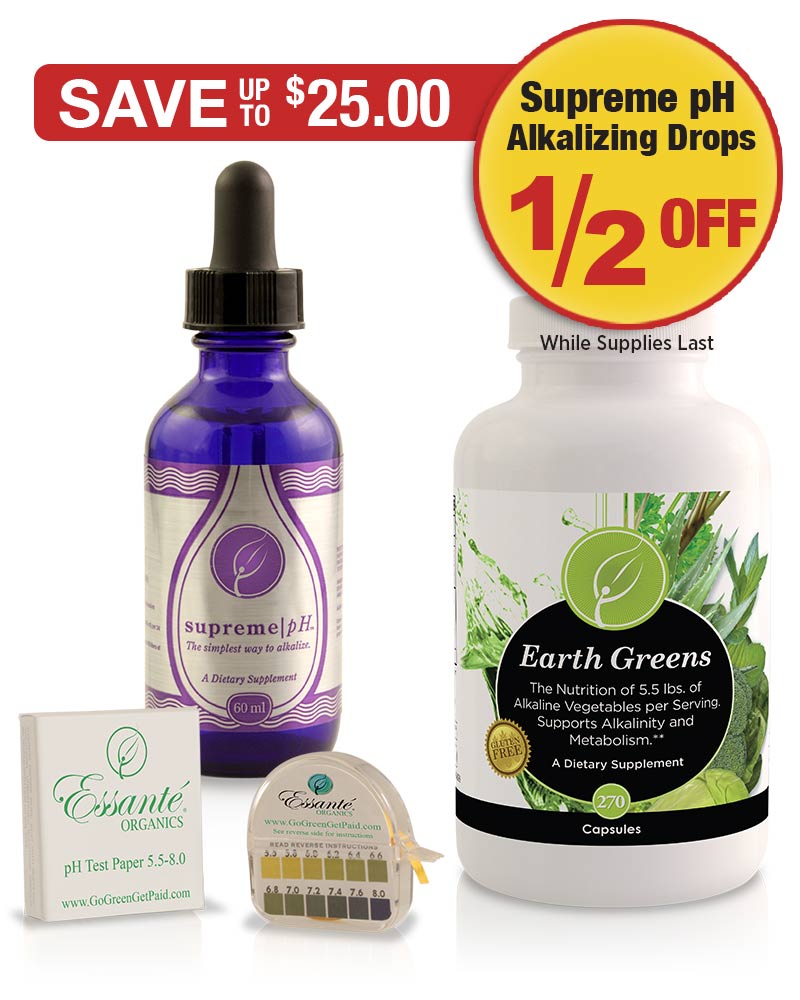 Save up to $25.00USD today! Contents: 1 - Supreme pH (60 ml) 1 - Earth Greens Capsules (90 count) 1 - pH Test Kit (100 tests for saliva or urine) Retail Customers Save: $25.00USD Wholesale Members Save: $19.25USD Points: 40