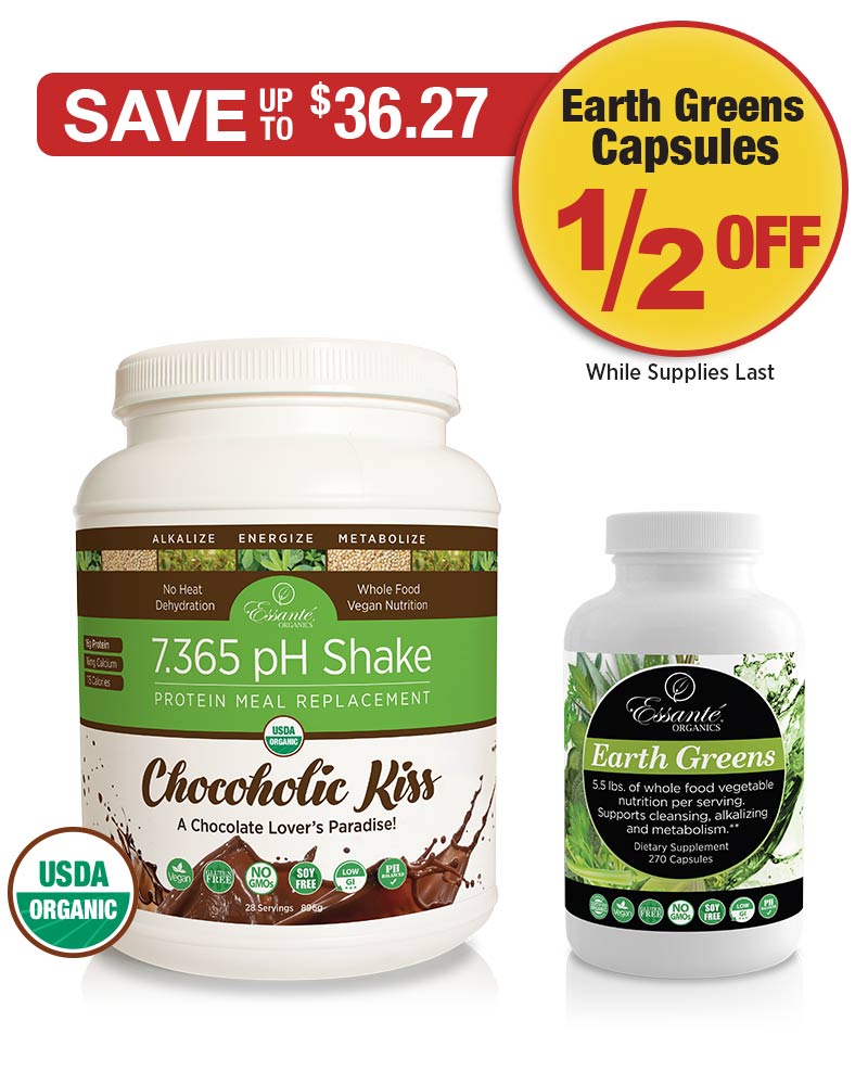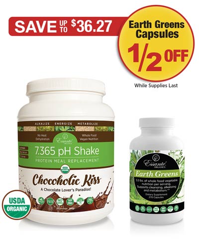 Contents: 1 - 7.365 pH Shake Chocoholic Kiss (28 Servings) 1 - Earth Greens Capsules (270 ct.) Retail Customers Save: $36.27 Wholesale Members Save: $27.90 Points: 50