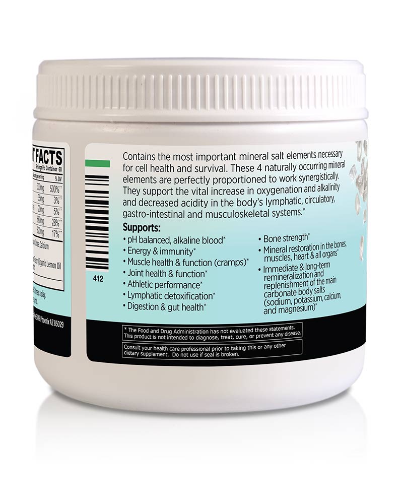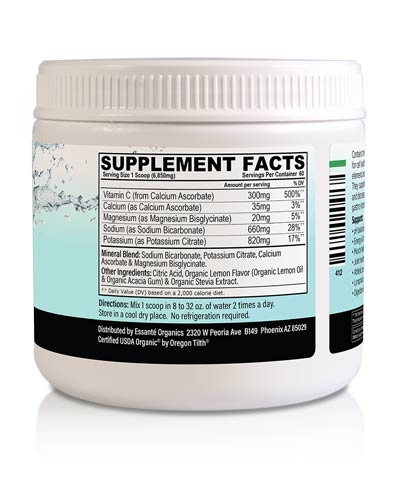 The Finest, Naturally Occurring, Elemental, Electrolyte Mineral & Vitamin C Supplement Powder. Aluminum free, vegan, alkaline producing, perfectly proportioned, refreshing, zesty, lemony tasting electrolyte remineralizer. Minerals are specific nutrients your body requires to function properly. 2 servings a day for adults (1 serving a day for children under 90 lbs.) supports: IMMUNITY - 600mg of Vitamin C to support the immune system, head pressure, blood pressure. ENERGY & CELL HEALTH- 3,070mg of combined electrolyte minerals enhance energy naturally without caffeine. If you suffer from low energy, fatigue or disease try this product now. HYDRATION & OXYGENATION - instant and ongoing electrolyte and mineralization replenishment. POST WORK OUT RECOVERY & PREMENOPAUSE SUPPORT - 3,070mg of combined electrolyte minerals replace vital, key electrolytes lost through perspiration. MUSCLES, JOINTS, BONES, ORGANS, CELLS (muscle cramps, gout) - cells, tissues, organs and systems require, uptake and store these 4 vital, high quality, salt minerals & electrolytes. They are needed for your body to function properly. pH BALANCE, ACID BURPING - 1,320mg of Sodium Bicarbonate (Baking Soda) delivers superior alkalinity / pH balance. If you suffer from acid burping, heartburn or gut issues after eating buy this product now, don't be in pain another day. Tap BENEFITS below for full list of ingredient benefits or tap ADD TO CART now. Tap COMPARISON CHART below to see how this product works better and costs less than Gatorade, Powerade, Coconut Water, and Emergen-C. Not all sodium is healthy or created equally. Ingredients: Calcium (Calcium Ascorbate) Electrolyte Mineral, Magnesium (Magnesium Bisglycinate) Electrolyte Mineral, Sodium (Sodium Bicarbonate - AKA alkaline Baking Soda) Electrolyte Mineral, Potassium (Potassium Citrate) Electrolyte Mineral, Vitamin C (Calcium Ascorbate, Buffered, Time Released), Citric Acid (from citrus), Organic Lemon Oil, Organic Acacia Gum (dietary fiber from acacia tree), & Organic Stevia Leaf Extract. Note: Minerals cannot be classified as organic. Tap INGREDIENTS & COMPARISON CHART below or tap ADD TO CART to try it now.